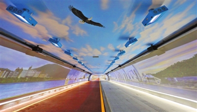 慢行隧道頂面以藍(lán)天白云為底色,并加入飛鳥、熱氣球等元素圖案,增添了人們通行其中的趣味性。更令人驚喜的是,在慢行隧道中段位置,有長約50米的視頻動畫投影段,在40個投影儀作用下,兩大主題宣傳片循環(huán)播放,展現(xiàn)珠海城市發(fā)展魅力。