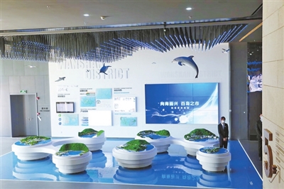 四樓展示城市風(fēng)貌。在這一層,偶爾可以看到一群海鷗凌空而過,白海豚躍出水面,或者仿佛立于樹蔭之下……多媒體的互動(dòng)襯托出珠?!吧胶O鄵?、陸島相望、城田相依、云天相映”的城市風(fēng)貌。